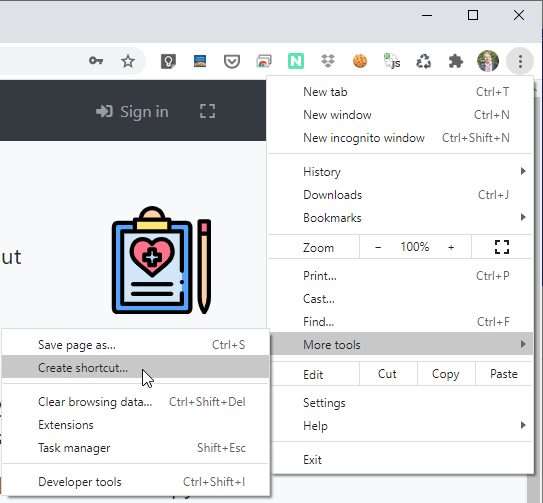 - Select “More tools | Create shortcut...” menu item (see the screenshot);